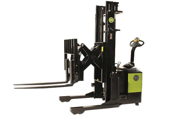 I-beam mast with dual lifting chains. Pantograph stroke extends the fork carriage beyond the unit’s straddle legs, with integral tilt and side shift.